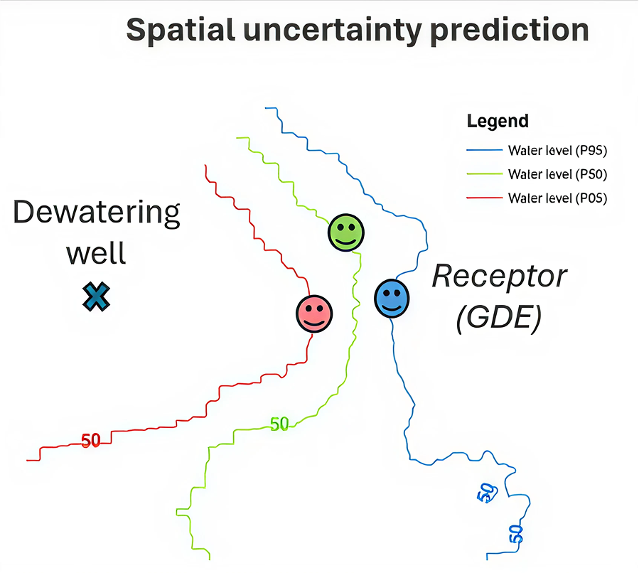 - Decision outputs: Probabilistic forecasts reported as P5/P50/P95 envelopes for excavation inflows, drawdown at receptors, well interference, and salt-load exports, with clear traceability from inputs to predictions.